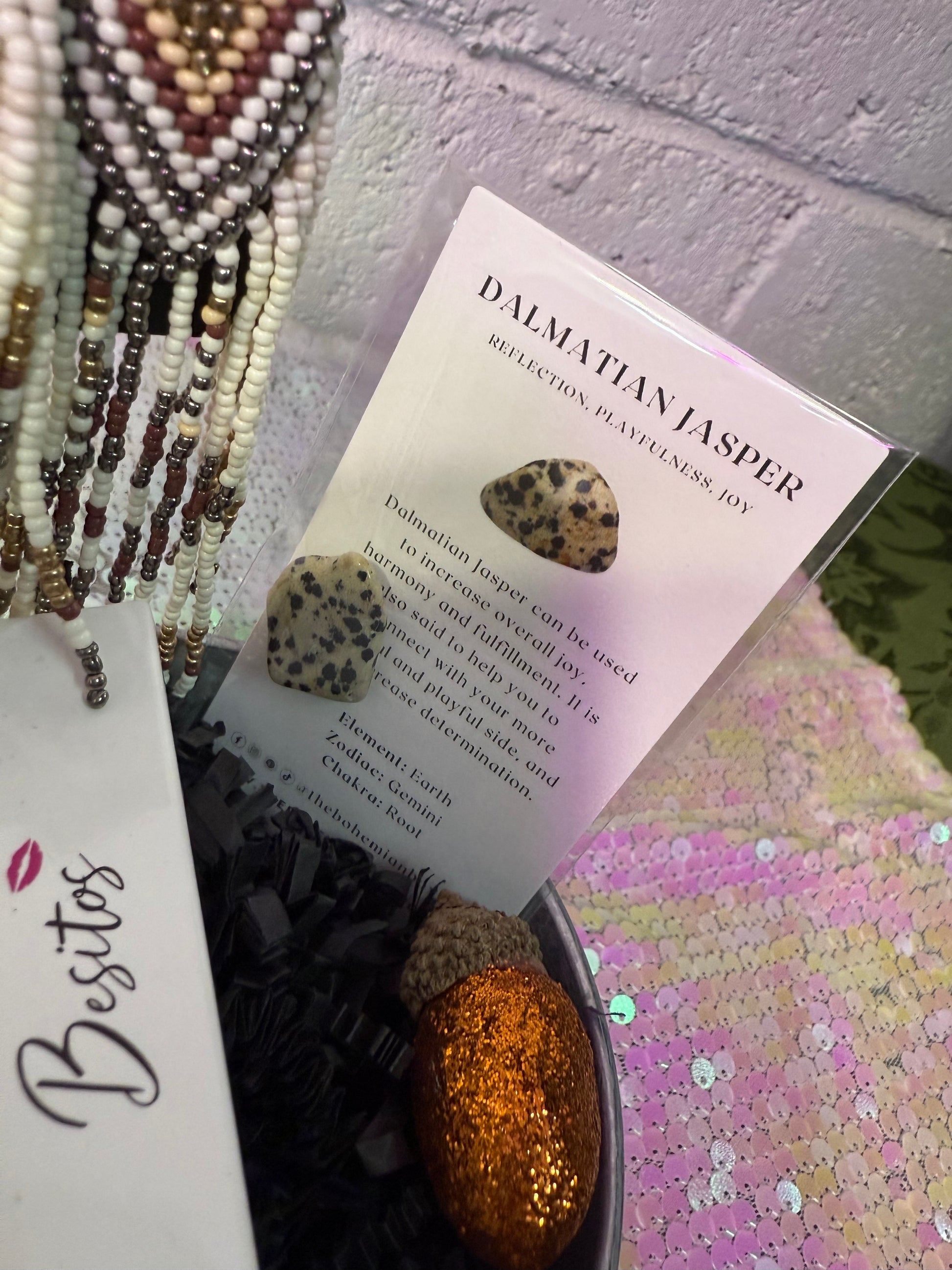 Featuring Native-beaded statement earrings, a Dalmatian Jasper intention card for harmony and joy, and our Havanas13 orange-tinted lip balm, this kit brings together earthy elegance and seasonal energy.